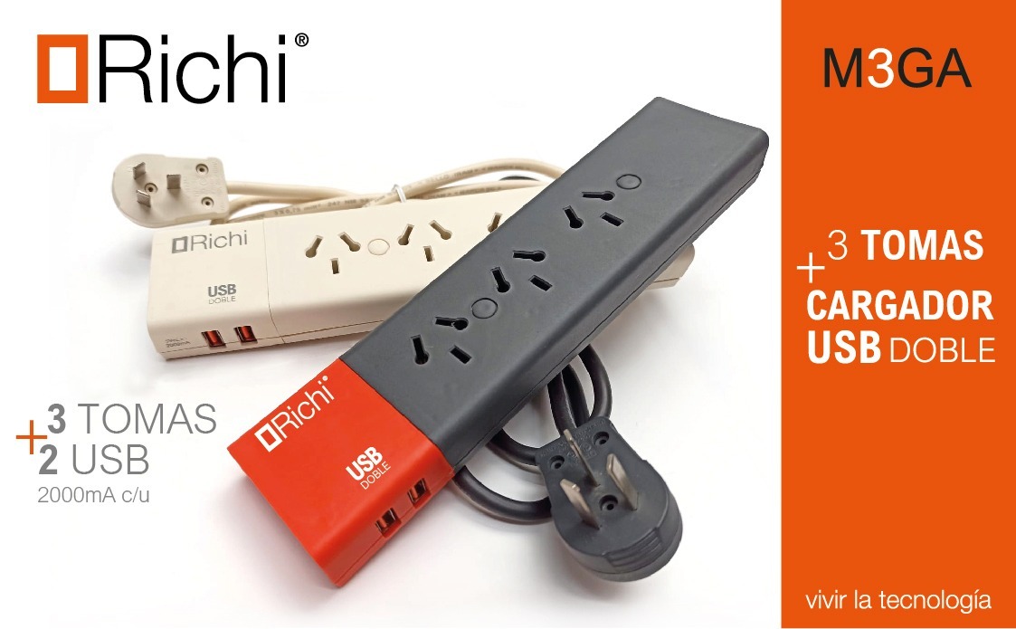 Zapatilla 3T – c/INT. TERMICO-CON Cable 1,5 mt Binorma 10A + 2 USB 5V 2A